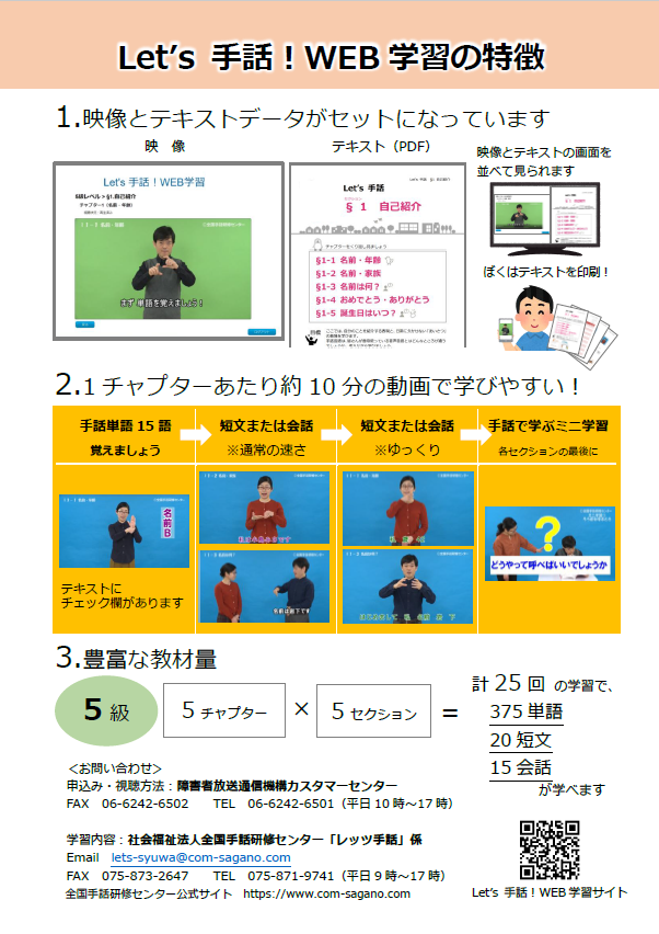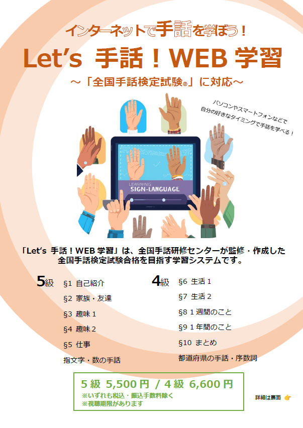 はじめませんか?Letʼs手話!WEB学習 作成日:2022年10月17日 Let‘s手話!WEB学習(れっつしゅわ!うぇぶがくしゅう)は、全国手話検定試験合格を目指す学習システムです。5級・4級の学習ができます。詳しくは、下のボタンから詳細ページにアクセスできます。 レッツ手話 WEB学習 詳細ページはこちら チラシ表 チラシ裏 投稿ナビゲーション 「手話通訳者等の養成カリキュラム策定事業」報告書発行のお知らせ >